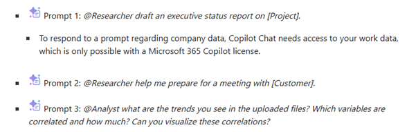 In-depth research through agents: For complex, research-intensive topics, you can use the Researcher and Analyst agents in Copilot. They consolidate information from your M365 environment and trusted sources, organize it into a structured response, and provide appropriate source references.