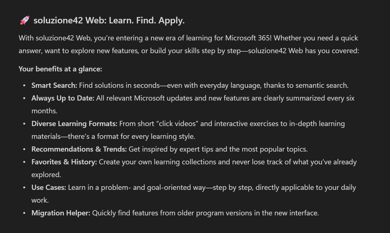 “soluzione42 Web QuickGuide (de).pdf — The attached soluzione42 Web Guide serves as the basis for a customer communication I need to prepare. Please analyze the document’s content and help me draft an announcement text to be published on my client’s intranet. The target audience are end users who should quickly grasp the key points of soluzione42 Web. The tone should be engaging and reflect modern learning. Please make a proposal.”