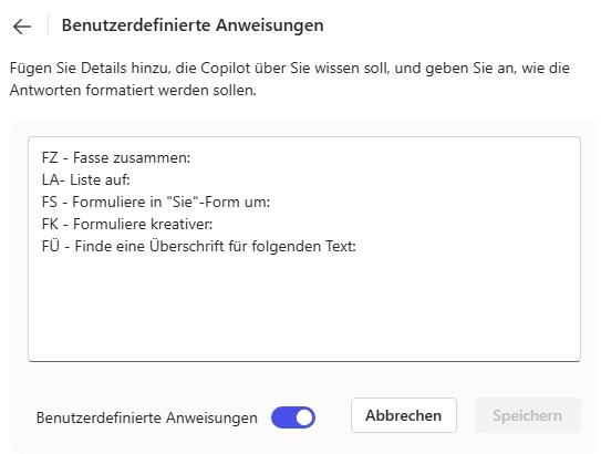 Mit den ‚Benutzerdefinierten Anweisungen‘ hinterlegen Sie in Copilot persönliche Regeln und Richtlinien. So weiß die KI, wie sie Inhalte formatieren, formulieren und auf Ihre Anforderungen reagieren soll – ähnlich wie bei der Memory-Funktion. Lesen Sie dazu unseren Beitrag Personalisierte KI dank Copilot Memory . Ein besonders praktischer Anwendungsfall ist das Hinterlegen von Shortcuts, mit denen Sie häufig genutzte Befehle blitzschnell abrufen oder Aufgaben für die KI übergeben. So genügt z. B. ‚ZF‘ statt ‚Fasse folgenden Text stichpunktartig zusammen und ergänze ein Fazit‘. Das spart Zeit und Tipparbeit.