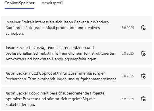 - Copilot berücksichtigt zuverlässig die im Memory hinterlegten Vorgaben – über mehrere Chats hinweg.
