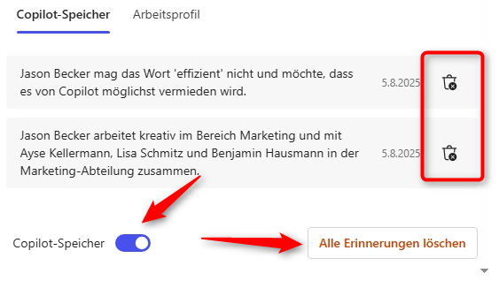 - Memory ist kein Tagebuch: Copilot speichert nur dauerhaft relevante Fakten, keine temporären Gedanken, Stimmungen oder To-dos.
