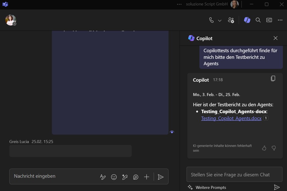 Der Prompt: „Ich habe mit Person A mehrere Copilot-Tests durchgeführt. Finde für mich bitte den Testbericht zu „Agents“.