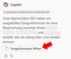 Das Ergebnis sieht nun anders aus. Wir bekommen von Copilot Pro ein Ereignisformular und müssen nun die Details prüfen. Außerdem teilt die KI uns mit, dass die Verfügbarkeit einer Person unbekannt ist.